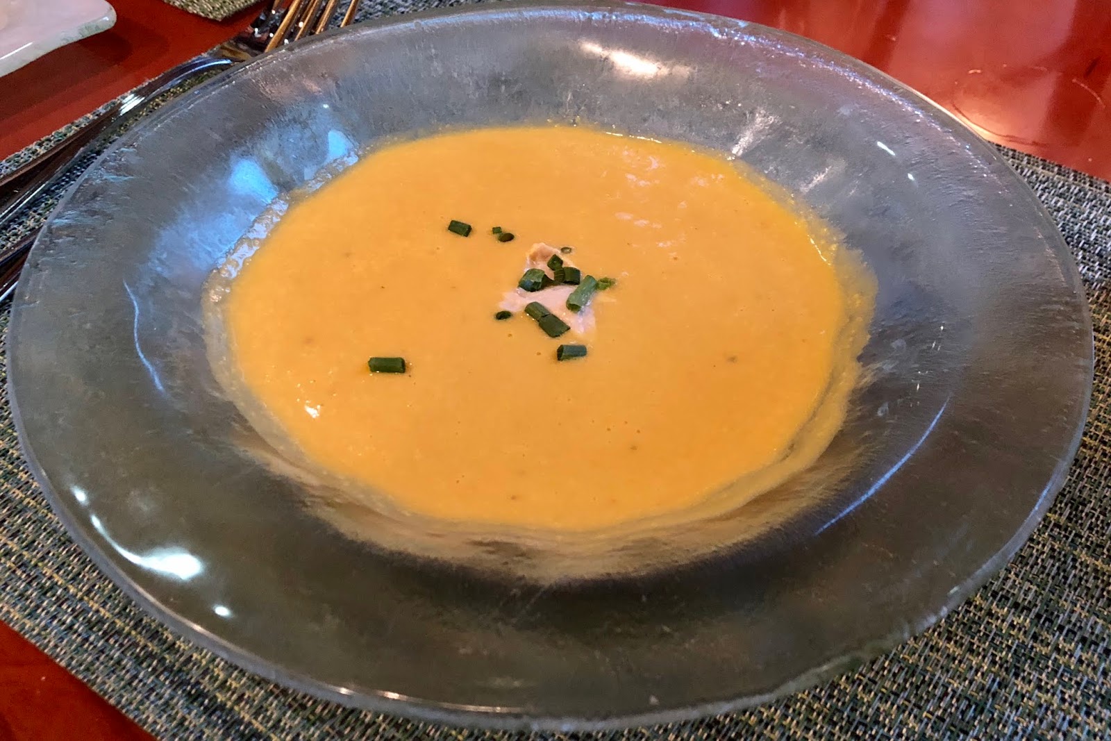 The menu offers choices in four different courses – soups, appetizers, entrées, and desserts – and you can pick three items all together. Marcia and I both started our meal with butternut squash soup, topped with cashew cream and chives. It was excellent, and we were both very happy with our choice.